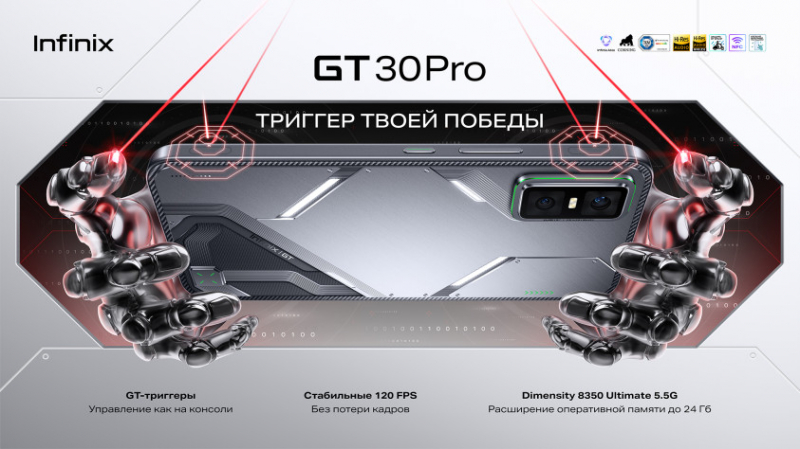 - Infinix GT 30 Pro гарантирует плавный и стабильный геймплей. Это особенно важно в состязательных шутерах, например, Call of Duty Mobile и PUBG Mobile. Смартфон держит 120 кадров в секунду без просадок даже в интенсивных боях. Сам AMOLED-дисплей разрешением 1,5К и диагональю 6,78 дюйма рассчитан на 144 Гц, а также обладает защитой зрения TÜV Rheinland.