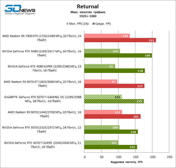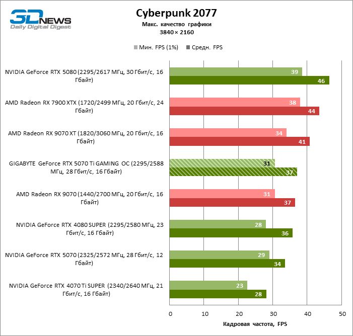 В большинстве тестовых игр GIGABYTE GeForce RTX 5070 Ti GAMING OC удерживает фреймрейт выше 60 FPS и на 4К-экране. Разница между двумя версиями GeForce RTX 5070 увеличилась до 23 % FPS, а GeForce RTX 5080 сулит быстродействие на 18 % выше, чем RTX 5070 Ti. Radeon RX 9070 XT сохранил за собой преимущество в 5 % средней кадровой частоты.