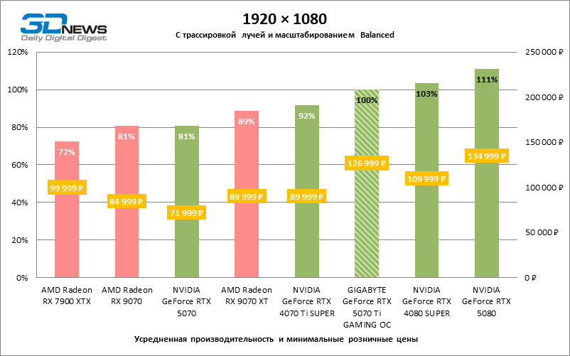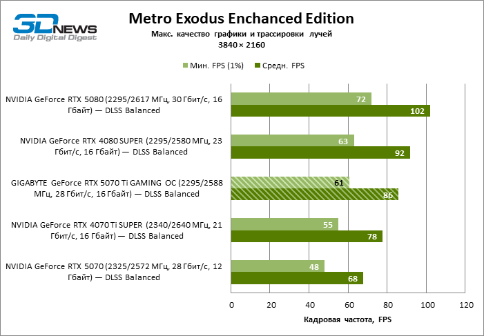 Благодаря масштабированию кадров с умеренным коэффициентом (Balanced) GIGABYTE GeForce RTX 5070 Ti GAMING OC покорились все тестовые игры в режиме 1440p. А вот полностью трассированные тайтлы в 4К достигают комфортного фреймрейта от 60 FPS уже лишь благодаря генерации кадров. По сравнению с базовой версией GeForce RTX 5070 продукт GIGABYTE быстрее на 24–26 %, а от GeForce RTX 5080 он отстает на 10–15 %. Апскейлинг сократил расстояние между GeForce RTX 5070 Ti и Radeon RX 9070 XT до 11–15 %.
